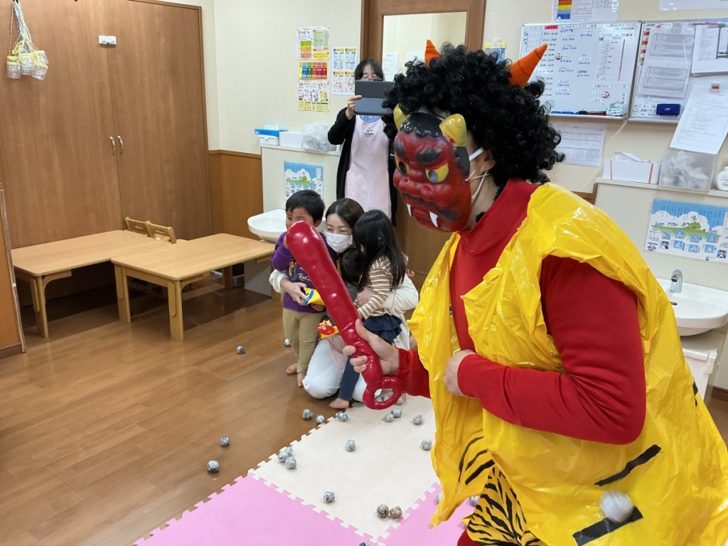ぺんぎん保育園に鬼さんがやってきました。この日にむけて、新聞紙を丸めた豆を作ったり、壁に張った鬼のイラストに向かって豆まきの練習をしていた子どもたち。いざ、鬼が登場すると、怖がったり、先生にしがみついたり、逃げたりしている子もいました。
