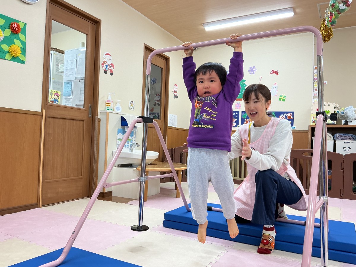 ぺんぎん保育園では、0〜2歳児の発達段階に合わせた運動プログラムの中で、室内で鉄棒遊びを行っています。